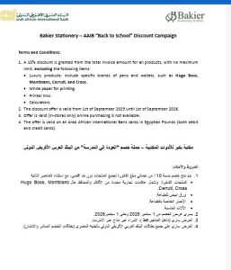 وقال البنك: اشتري كل الأدوات الدراسية اللي محتاجها من مكتبة بكير بخصم 10% لما تدفع ببطاقات الائتمان والخصم المباشر من البنك العربى الإفريقى الدولى