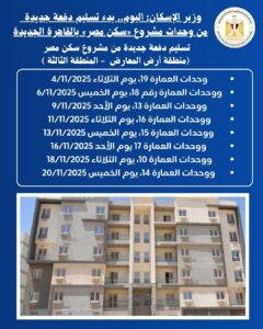 وأوضح المهندس أحمد رشاد، رئيس جهاز تنمية مدينة القاهرة الجديدة، أنه سيتم تسليم دفعة جديدة من مشروع سكن مصر (منطقة أرض المعارض – المنطقة الثالثة )، حيث سيتم تسليم وحدات العمارة 19، يوم الثلاثاء 4/11/2025، ووحدات العمارة رقم 18، يوم الخميس 6/11/2025، ووحدات العمارة 13، يوم الأحد 9/11/2025، ووحدات العمارة 16، يوم الثلاثاء 11/11/2025، ووحدات العمارة 15، يوم الخميس 13/11/2025، ووحدات العمارة 17 يوم الأحد 16/11/2025، ووحدات العمارة 10، يوم الثلاثاء 18/11/2025، ووحدات العمارة 14، يوم الخميس 20/11/2025.