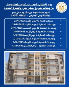 وقال: سيتم تسليم وحدات العمارة 2، يوم الأحد 7/12/2025، ووحدات العمارة 4، يوم الإثنين 8/12/2025، ووحدات العمارة 3، يوم الثلاثاء 9/12/2025، مضيفاً أنه على العملاء الفائزين بوحدات سكنية، التوجه لبنك التعمير والإسكان فرع مدينة نصر (2 شارع عباس العقاد)، وذلك لإنهـاء إجـراءات التعاقد بالبنك، ثم التوجـــه لجهاز المدينة بأصل خطـــاب البنك، وصورة من الشيكات الموقع عليها، وذلك لتسجيل البيانات على الشبكة، واستلام خطاب للموقع لمعاينة واستلام الوحدة.