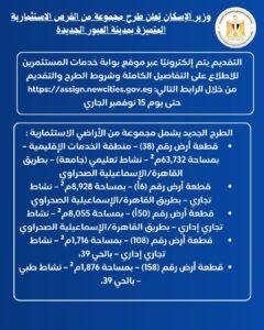 ويأتي هذا الطرح ضمن جهود الدولة لتعزيز الاستثمارات في المدن الجديدة، ورفع كفاءتها كوجهات اقتصادية واستثمارية متكاملة، قادرة على استيعاب مشروعات متنوعة تساهم في تحسين جودة الحياة وتوفير فرص عمل متنوعة للمواطنين.