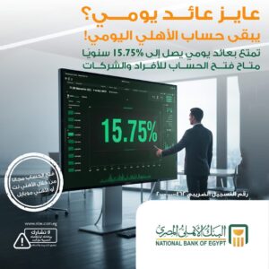 أعلن البنك الأهلي المصري عن إطلاق حساب الأهلي اليومي (حساب جاري) للأفراد والشركات مجاناً، مع عائد يومي يصل إلى 15.75% سنوياً، لتلبية احتياجات العملاء الراغبين في الجمع بين السيولة اليومية وتحقيق عائد تنافسي.