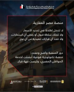 أكدت منصة مصر العقارية الرسمية أن دورها يقتصر على توفير منظومة تكنولوجية قومية آمنة وشفافة لخدمة المواطن المصري، دون أي تدخل منها في تحديد أسعار الوحدات العقارية أو اتخاذ قرارات تنفيذية تخص السوق.
