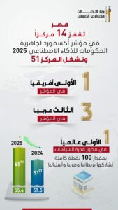 يُذكر أن مصر حققت تقدمًا تراكميًا قدره 46 مركزًا عالميًا في مؤشر جاهزية الحكومات للذكاء الاصطناعي خلال الفترة من 2019 إلى 2024، حيث انتقلت من المركز 111 عالميًا إلى المركز 65، قبل أن تواصل صعودها في إصدار 2025.