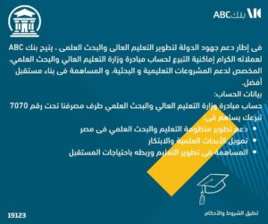 في إطار دوره المجتمعي ومساندته لجهود الدولة في الارتقاء بمنظومة التعليم والبحث العلمي، أعلن بنك ABC عن إتاحة إمكانية التبرع عبر حساب مبادرة وزارة التعليم العالي والبحث العلمي، بما يتيح للعملاء المشاركة في دعم المشروعات التعليمية والبحثية والمساهمة في بناء أجيال قادرة على الابتكار والتنمية.