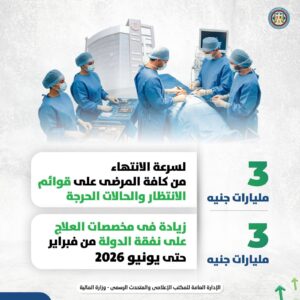 وأشار وزير المالية إلى أن هناك ٣ مليارات جنيه لسرعة الانتهاء من قوائم انتظار المرضى والحالات الحرجة لتخفيف آلامهم وأسرهم، موضحًا أن هناك ٣ مليارات جنيه زيادة أيضًا في مخصصات العلاج على نفقة الدولة لمحدودي الدخل، ممن ليس لهم تغطية تأمينية في الفترة من فبراير حتى يونيو ٢٠٢٦، موضحا أن فخامة الرئيس وجه بعلاج كل الحالات الحرجة على نفقة الدولة حتى نحتفل بشفائها مع حلول عيد الفطر.