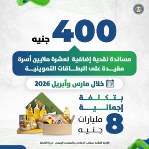 وأوضح الوزير أن الحزمة الجديدة تتضمن مساندة نقدية مباشرة للفئات المستحقة لتحسين أحوالهم بمناسبة شهر رمضان وعيد الفطر، لافتًا إلى أن هناك مساندة نقدية إضافية بقيمة ٤٠٠ جنيه لعشرة ملايين أسرة مقيدة على البطاقات التموينية خلال شهري مارس وأبريل ٢٠٢٦، بتكلفة إجمالية ٨ مليارات جنيه، ومساندة نقدية إضافية أيضًا بقيمة ٤٠٠ جنيه خلال “رمضان” و”العيد” لـ ٥,٢ مليون أسرة مستفيدة من برنامج “تكافل وكرامة” بتكلفة إجمالية ٤ مليارات جنيه، وكذلك مساندة نقدية إضافية بـ ٣٠٠ جنيه خلال رمضان والعيد لـ ٤٥ ألفًا من المستفيدين بمعاش الطفل والرائدات الريفيات.