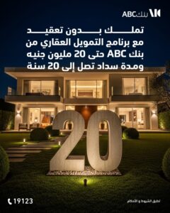أعلن بنك ABC عن إطلاق برنامج تمويل عقاري جديد يتيح للعملاء الحصول على تمويل يصل إلى 20 مليون جنيه، مع فترة سداد تصل إلى 20 سنة، لتسهيل امتلاك وحداتهم السكنية دون تعقيدات مالية.