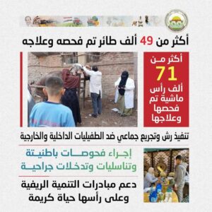 وأضاف أن القوافل شملت أيضًا فحص وعلاج أكثر من 49 ألف طائر، ضمن جهود دعم قطاع الثروة الداجنة والتربية المنزلية، وتحسين معدلات الأمان الحيوي بالقرى.